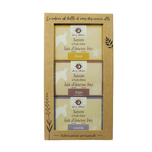 Ce coffret comprend 3 savons lait d'ânesse 100g.